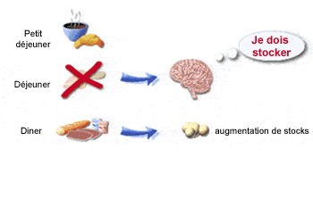 - Ce « jeûne » de courte durée met le corps en situation de « détresse » et au repas suivant, par crainte d’être encore en disette, l’organisme sécrètera un surcroît d’insuline, favorisant le stockage et donc la prise de poids .
